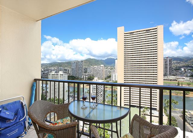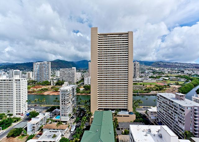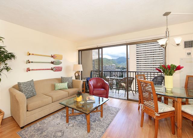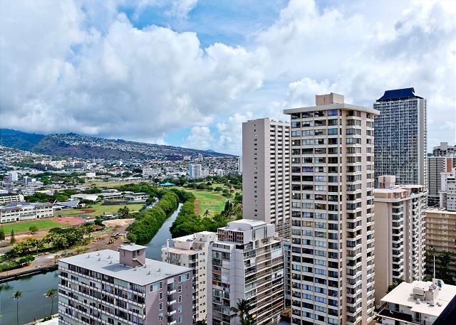 Located on the cool side of the building, you'll enjoy lovely Ala Wai Canal and Ko'olau Mountain views from this well-equipped 23rd floor one-bedroom condo (553 sqft plus lanai with table and chairs), in one of Waikiki's most sought after condominiums, Four Paddle! City lights sparkle at night! 4-person max.
