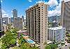 You'll enjoy a partial ocean view from this 24th floor one-bedroom corner unit with central AC (553 sq.ft. plus lanai) (remodeled in 2017) at Four Paddle, one of Waikiki's premier residential condominiums with 24-hour security! 2-person max.
