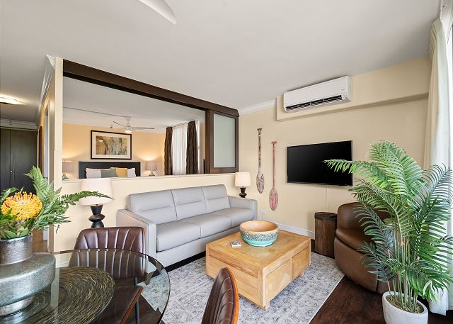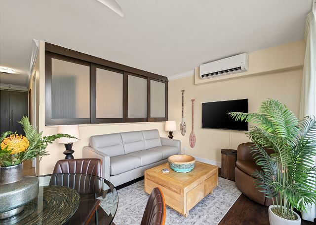 Comfort AND Convenience! Newly decorated, fully-furnished end condo (693 sq. ft. plus two lanais with tables and chairs, for a total of 910 sq. ft.) at the Regency on Beachwalk, right in the heart of Waikiki and steps from the best beaches, fun outdoor activities, top restaurants, night life, unparalleled shopping at Waikiki Beach Walk, and just across the street from Trump Tower! 6-person max.