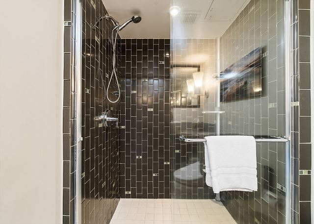 – Walk-in shower (no tub) with handheld shower wand