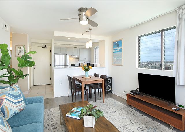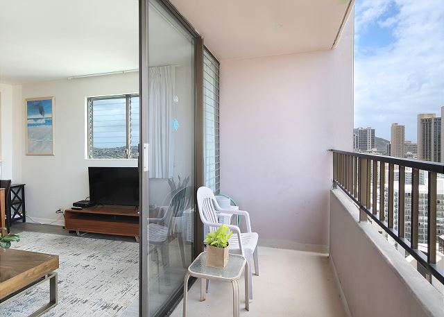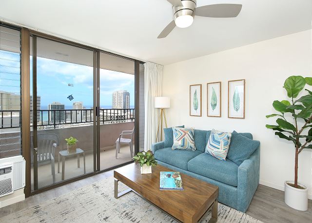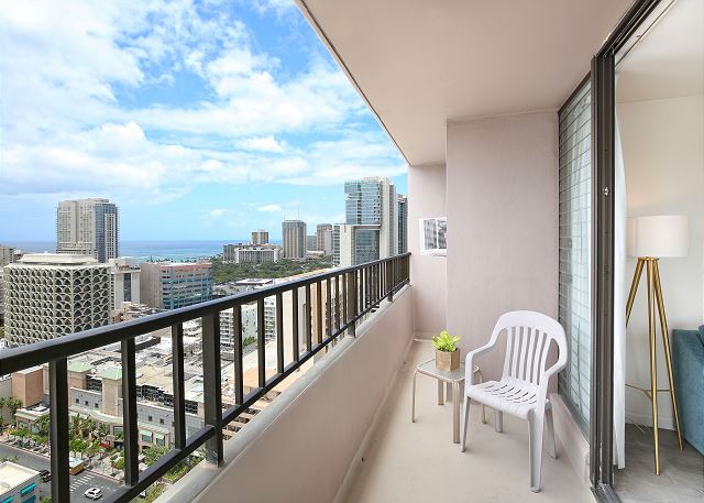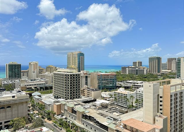 Partial ocean view unit on the 24th floor of Royal Kuhio, right in the heart of Waikiki! This 1-bedroom, 1-bath condo features 538 sqft of living space, plus a 76-sqft private lanai that offers sweeping views of the Pacific Ocean and Waikiki skyline. Perfect for solo travelers, couples, and small families. Sleeps up to 4.