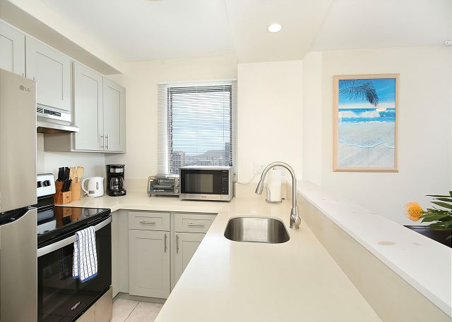 – Full kitchen appliances including 4-burner stovetop/oven, full-size refrigerator, microwave, toaster oven, dishwasher, coffee maker, rice cooker