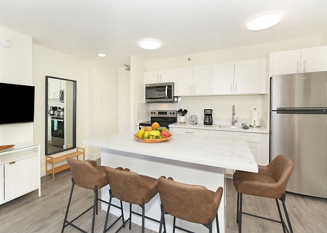 - Kitchen Coffee Maker, Cookware/Dishes/Utensils, Dishes & Utensils, Full Kitchen, Kitchen, Kitchen Island, Microwave, Oven, Refrigerator, Rice Cooker, Stove, Stove/Cooktop/Hot Plate, Tea Pot/Kettle, Toaster