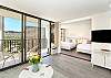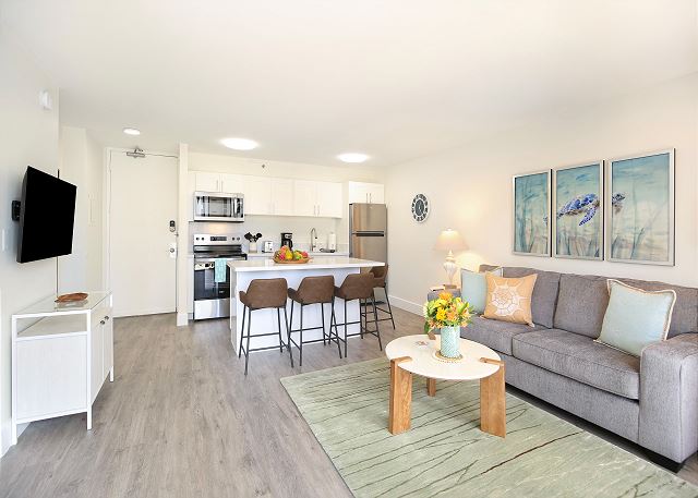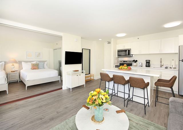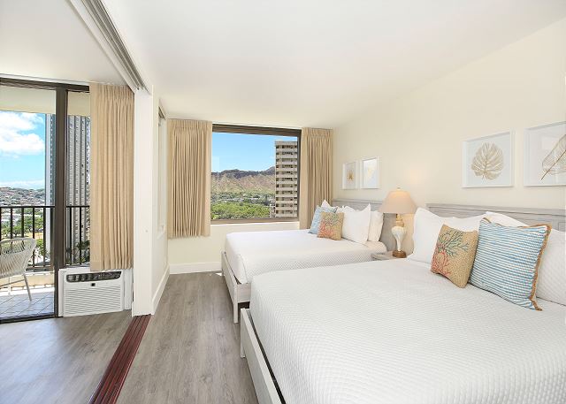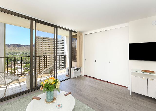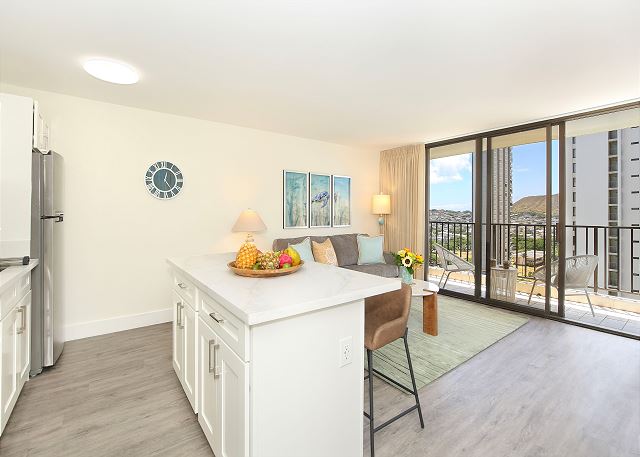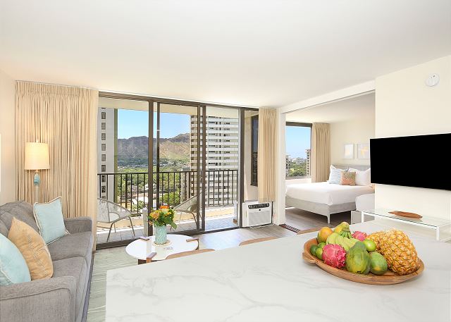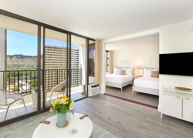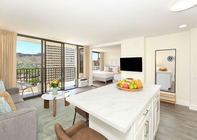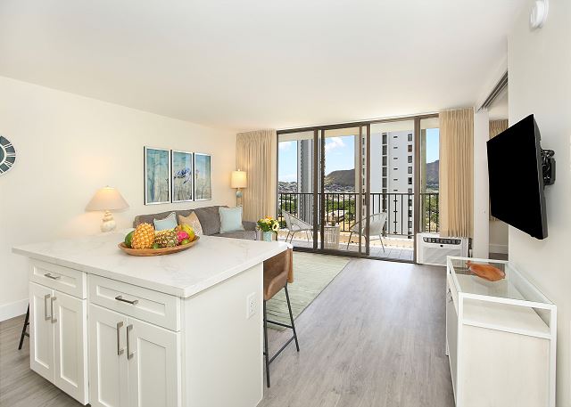 You'll fall in love with this contemporary one-bedroom suite (533 sf + 67-sf private lanai), fully renovated in 2024, at the repeat-guest favorite Waikiki Banyan! Enjoy the vibrant greens and blues of the gorgeous Diamond Head, Kapiolani Park, and peak-a-boo ocean views. With a full kitchen, free Wi-Fi, and free parking, this is the perfect home-away-from-home for couples, small families, and solo travelers.
