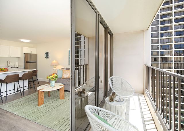 – Access to private lanai with Diamond Head, park, and peak-a-boo ocean view (with small table and chairs)